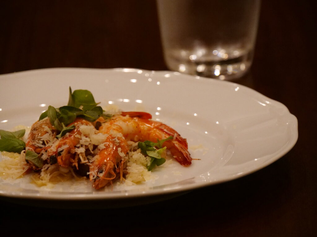 低温調理で焼いたうるみえびにパルメザンチーズ、きのこ、ハーブを合わせた白ワインの合うおしゃれな一品です🍷