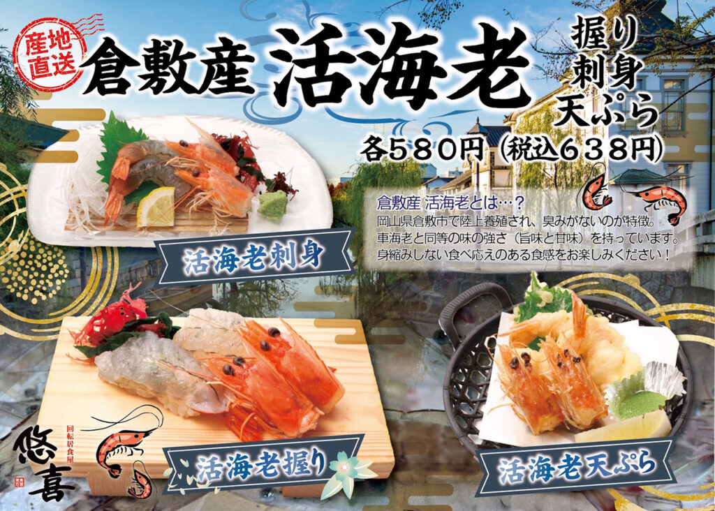 岡山県内で愛される回転居食屋「悠喜(ゆうき)」さんで、「うるみえび」が定番メニューとして採用されました!