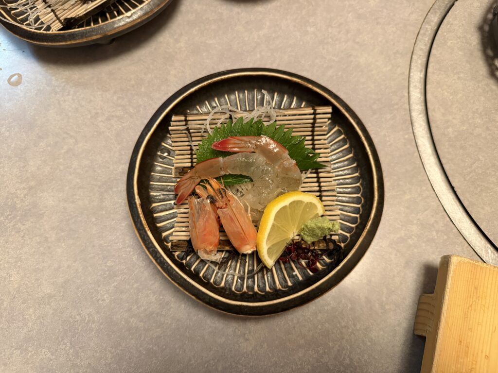 まずはこれ。「うるみえび」の真骨頂です。 徹底した水質管理で育てているので、生臭さが一切ありません。一緒に出される甘みのあるお醤油につけて、うるみえびの甘みと相性ばっちりでおいしくいただけます。